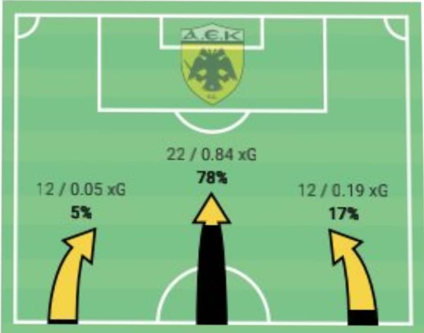 Στην πλειονότητα των φετινών αγώνων, οι ποιοτικότερες ευκαιρίες της έχουν δημιουργηθεί από τον άξονα. Δεν θα μπορούσε να αποτελεί εξαίρεση ο αγώνας με τον Βόλο. Το 78% των ποιοτικότερων ευκαιριών προήλθαν από την γραμμή του άξονα με 22 επιθέσεις και ποσοστό xG στο 0,84%. Τα συνολικά xG της ΑΕΚ σε αυτόν τον αγώνα ήταν 1,08 άρα λοιπόν βάσει αριθμών πήρε οτι ακριβώς δικαιούταν απ’ αυτόν τον αγώνα