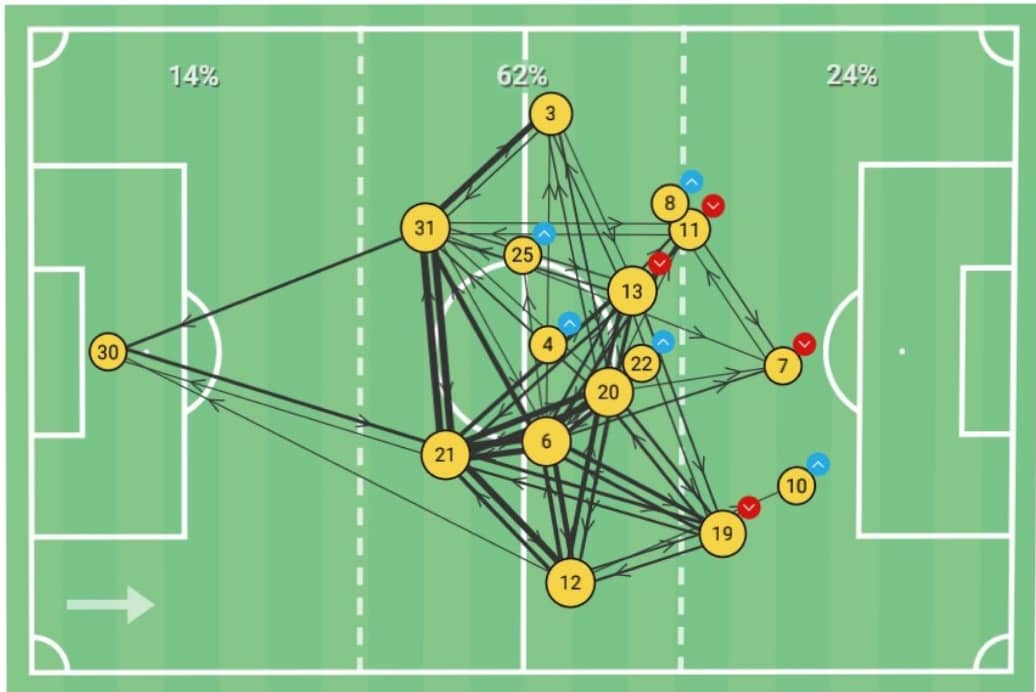 Επιστρέφοντας στις μεταβιβάσεις, παρατηρούμε στο κάτω γράφημα, αυτό που ανέφερα στην αρχή σχετικά με τις “κοντές” μεταβιβάσεις μεταξύ των στοπερ των κεντρικών μέσων αλλά και των μπάκ. Βίντα – Τζαβέλας – Γιονσον – Μάνταλος – Ρότα – Μοχαμάντι – Πινέδα άλλαξαν μεταξύ τούς περισσότερες απο 3 μεταβιβάσεις.