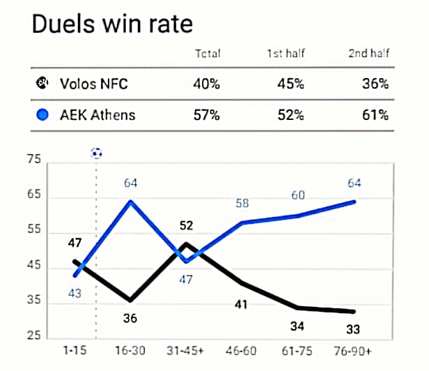 Ειδικά απο το ξεκίνημα το δεύτέρου μέρους, δεν υπήρξε χρονικό σημείο που να χάσει τις μονομαχίες απο την ομάδα του Βόλου. 57% έναντι 40%. Είχε 95 κερδισμένες μονομαχίες έναντι 66 του Βόλου, 32 κερδισμένες επιθετικές μονομαχίες έναντι 16 του Βόλου αλλά και 41 κερδισμένες αμυντικές μονομαχίες έναντι 31 του Βόλου.