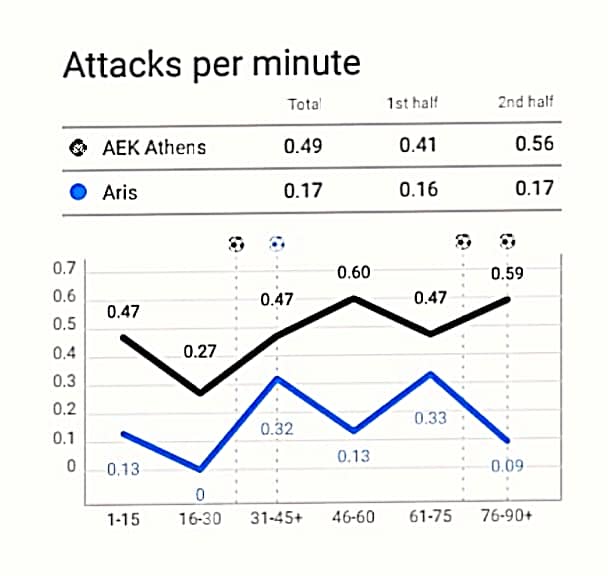 Αυτός ο πίνακας μας δείχνει τις επιθέσεις που έκανε η κάθε ομάδα ανά λεπτό. Μπορούμε να δούμε ότι η ΑΕΚ έκανε σχεδόν μισή επίθεση ανά λεπτό σε σύγκριση με τον Άρη το ποσοστό του είναι αρκετά πιο χαμηλό με τον μέσο όρο να φτάνει στις 0,17 επιθέσεις ανά λεπτό.