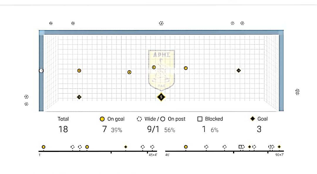 Στο κάτω γράφημα μπορούμε να δούμε τις 18 συνολικά τελικές της ΑΕΚ από τις οποίες οι 7 ήταν στο στόχο και όλες μέσα από την μεγάλη περιοχή.