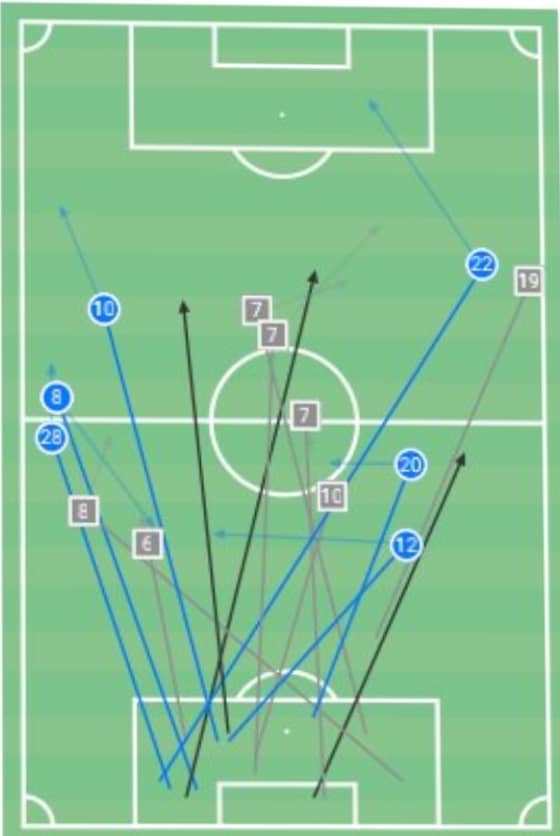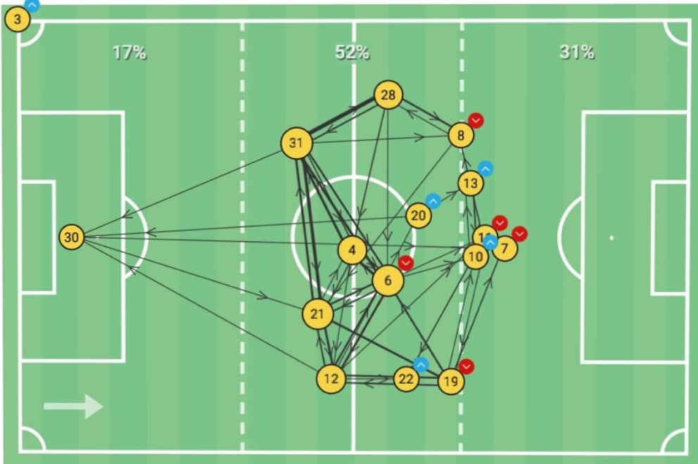 Το 52% του παιχνιδιού παίχτηκε στο μεσαίο τρίτο του γηπέδου δεν κατάφερε να αλλάξει πάρα πολλές φορές την μπάλα όσο στα προηγούμενα παιχνίδια στο γήπεδο της, άν και η ακρίβεια στις μεταβιβάσεις σε έναν ακόμη αγώνα ήταν καλά επίπεδα. Συγκεκριμένα τελείωσε τον αγώνα με 83% ακρίβεια με 330 στις 394 μεταβιβάσεις, με 88% ακρίβεια στις προωθητικές με 58 στις 66, στις smart passes 50% ακρίβεια με 4 στις 8, και είχε 17 deep completion, δηλαδή η μη διαγώνιες μεταβιβάσεις σε απόσταση 20 μέτρων από την αντίπαλη εστία.