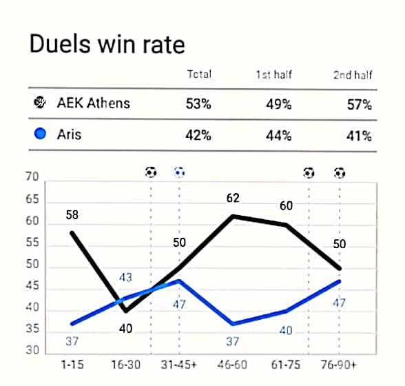 Η ΑΕΚ πήρε και τις μονομαχίες με 53% έναντι 42% του Άρη. Μόνο στο τέταρτο 16′ – 30′ βρέθηκε να τις χάνει σύμφωνα με τον πίνακα που βλέπουμε παρακάτω. Σε σύνολο 201 μονομαχιών η ΑΕΚ πήρε τις 107.