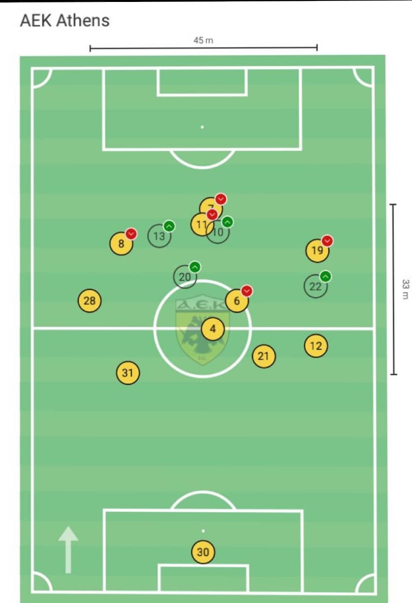 Η ΑΕΚ άρχισε το παιχνίδι με τρείς αλλαγές σε σχέση με τον αγώνα με τον Βόλο. Τον Χατζισαφί αντί του Μοχαμάντι στα αριστερά στην άμυνα, τον Γκατσίνοβιτς αντί του Πινέδα και τον Σιμάνσκι αντί του Μάνταλου.