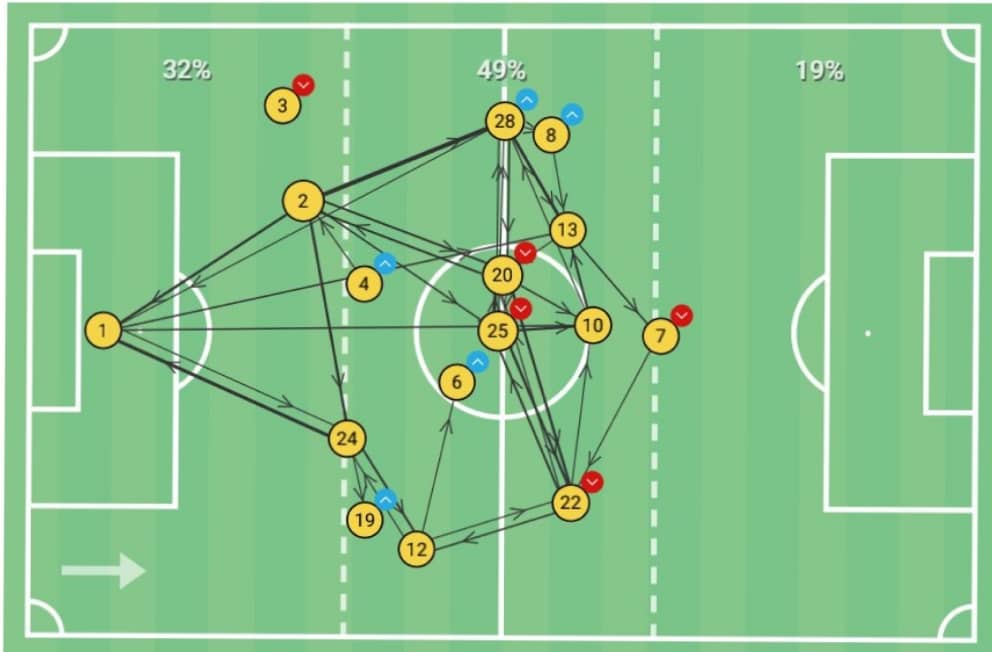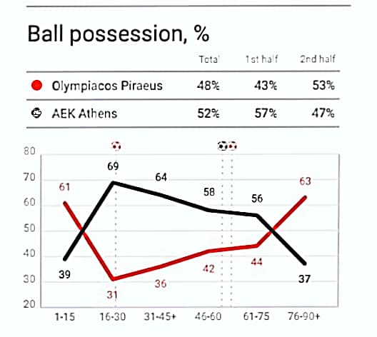 Στο μεγαλύτερο μέρος του παιχνιδιού είχε την κατοχή της μπάλας. Συγκεκριμένα από το 16′ έως και το 75′ όπως μας δείχνει και το γράφημα, και μόνο στο πρώτο τέταρτο και στο τελευταίο την έχασε. Ο Ολυμπιακός στο διάστημα που δεν είχε την κατοχή, προσπάθησε να παίξει με μεγάλες μεταβιβάσεις πότε στα άκρα πότε προς τον Μπακαμπού.