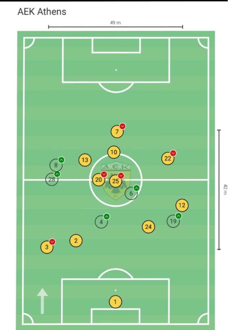 Η διάταξη που μας δίνει το wyscout ότι είχε η ΑΕΚ ήταν 4-2-3-1, με Γαλανόπουλο και Μάνταλο στα κεντρικά χάφ με τον Μάνταλο να κινείται σαν 8αρι, τον Πινέδα αριστερά αλλά να συγκλίνει στον άξονα, τον Φερνάντες δεξιά, και τον Τσούμπερ πίσω από τον Λιβάι Γκαρσία, και σε μερικές περιπτώσεις να αλλάζουν μεταξύ τους θέσεις.