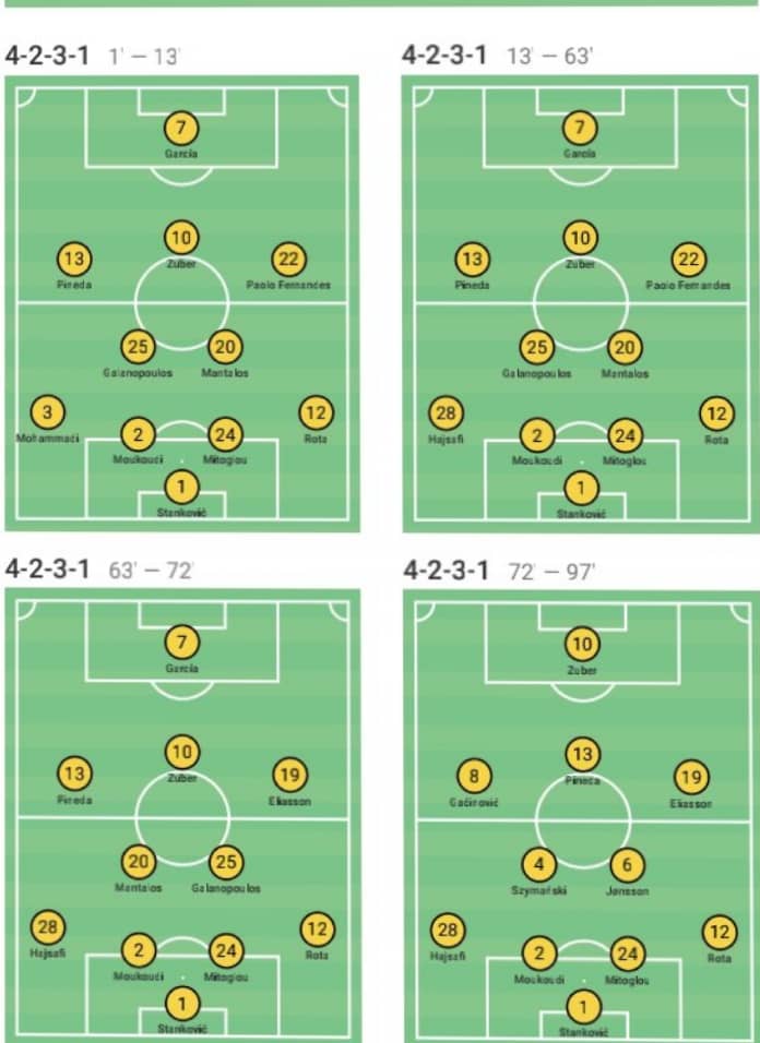 Απ’ το 72΄ο Τσούμπερ πήγε στην κορυφή της επίθεσης ο Πινέδα γύρισε σε θέση δεύτερου επιθετικού (ψευτοεννιάρι), ο Γκατσίνοβτις αριστερά και ο Ελίασον δεξιά.