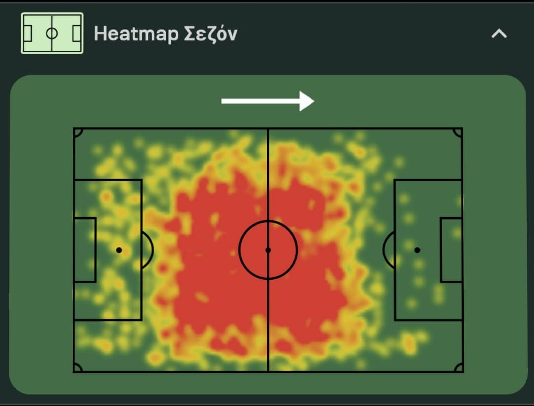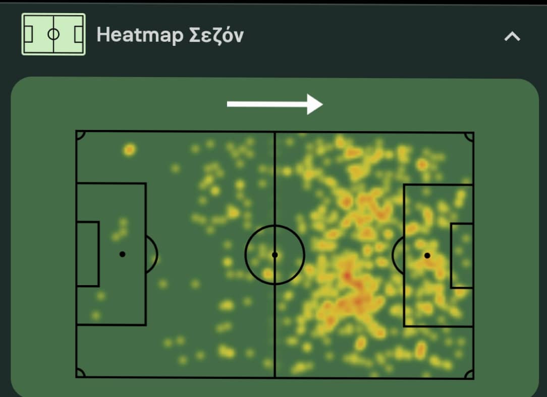 Βλέποντας το γράφημα, ο άξονας του μεσαίου τρίτου και τα δύο άκρα του επιθετικού τρίτου είναι οι χώροι που προτιμάει να παίζει στην πλάτη της άμυνας του αντιπάλου του.