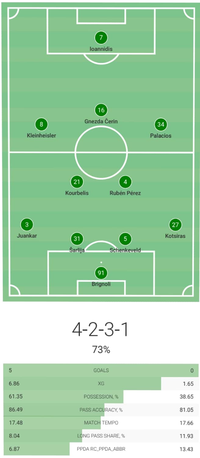 Σύμφωνα με το wyscout, το 4-2-3-1 χρησιμοποιήθηκε 73% και το 4-4-2 21%. Άρα βλέπουμε μία σαφή προτίμηση σε διάταξη με δύο αμυντικά χαφ (6άρια) τον Πέρεθ με τον Κουρμπέλη, τον Τσέριν να κινείται σε θέση 10 αλλά περισσότερο κοντά στα 6άρια παρά στον επιθετικό, και δύο εξτρέμ τον Παλάσιος από δεξιά και τον Κλεινχέισλερ ή τον Μπερνάρ από αριστερά. Στην κορυφή της επίθεσης φαίνεται να υπάρχει μια προτίμηση στον Ιωαννίδη. Στα άκρα της άμυνας αριστερά υπάρχει σταθερά ο Χουάνκαρ, και αριστερά εναλλάσονταν οι Κώτσιρας με τον Σάντσεζ.