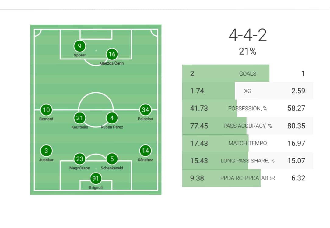 Ο δεύτερος σχηματισμός που επέλεξε ο Σέρβος τεχνικός, ήταν το 4-4-2, με τέσσερις παίκτες στα χάφ στην ουσία, Κουρμπέλης και Πέρεθ σε θέση 6, αριστερά ο Μπερνάρ, δεξιά ο Παλάσιος, στην κορυφή ο Σπόραρ και από πίσω του ο Τσέριν. Με αυτόν τον σχηματισμό, πέτυχε 2 γκολ, δέχθηκε 1, τα xG υπέρ ήταν 1,74 και 2.59 κατά κάτι που μας δείχνει ότι με την συγκεκριμένη διάταξη δεν λειτουργεί αποτελεσματικά τόσο επιθετικά όσο και αμυντικά. Η κατοχή ήταν 42% – 58% , προτίμησε περισσότερο τις μεγάλες μεταβιβάσεις με 15 μέσο όρο, και η πίεση ψηλά ήταν στα επίπεδα των 9 μεταβιβάσεων επιθετικά αλλά και αμυντικά περιορίστηκε στις 6 μεταβιβάσεις μέσο όρο.