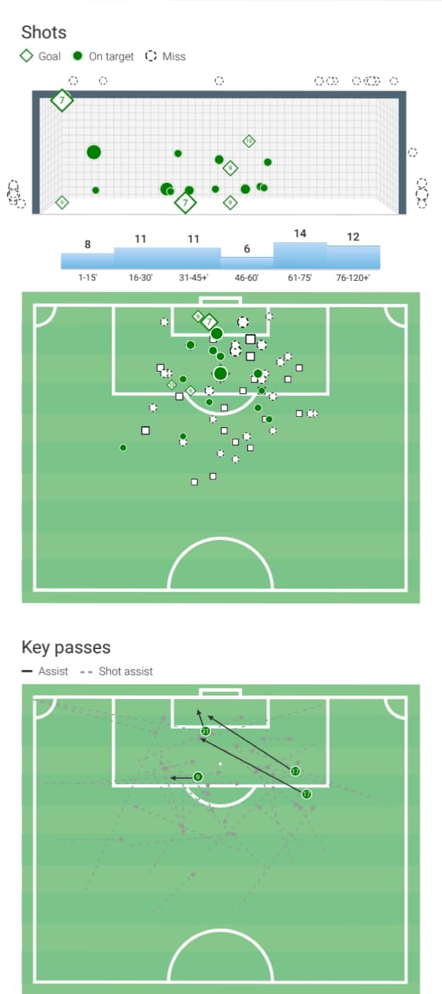 Στο επόμενο γράφημα μπορούμε να δούμε αναλυτικά τις ευκαιρίες που δημιούργησε και ανα τέταρτο, απο ποιό σημείο έγιναν αλλά και τις key passes.