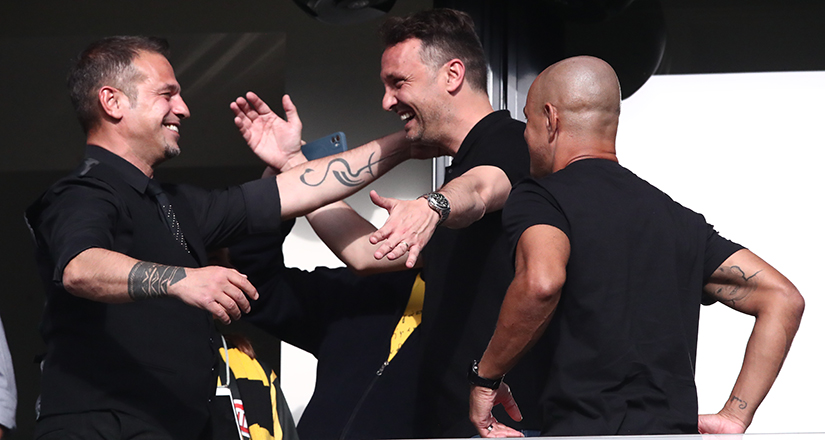 Οι τρεις παλαίμαχοι άσοι της ΑΕΚ παρουσιάστηκαν στα μάτριξ της OPAP Arena -σε ζωντανή σύνδεση- από τα επίσημα του γηπέδου, γνωρίζοντας την αποθέωση από τον κόσμο που έχει κατακλύσει τον ΝΑΟ.