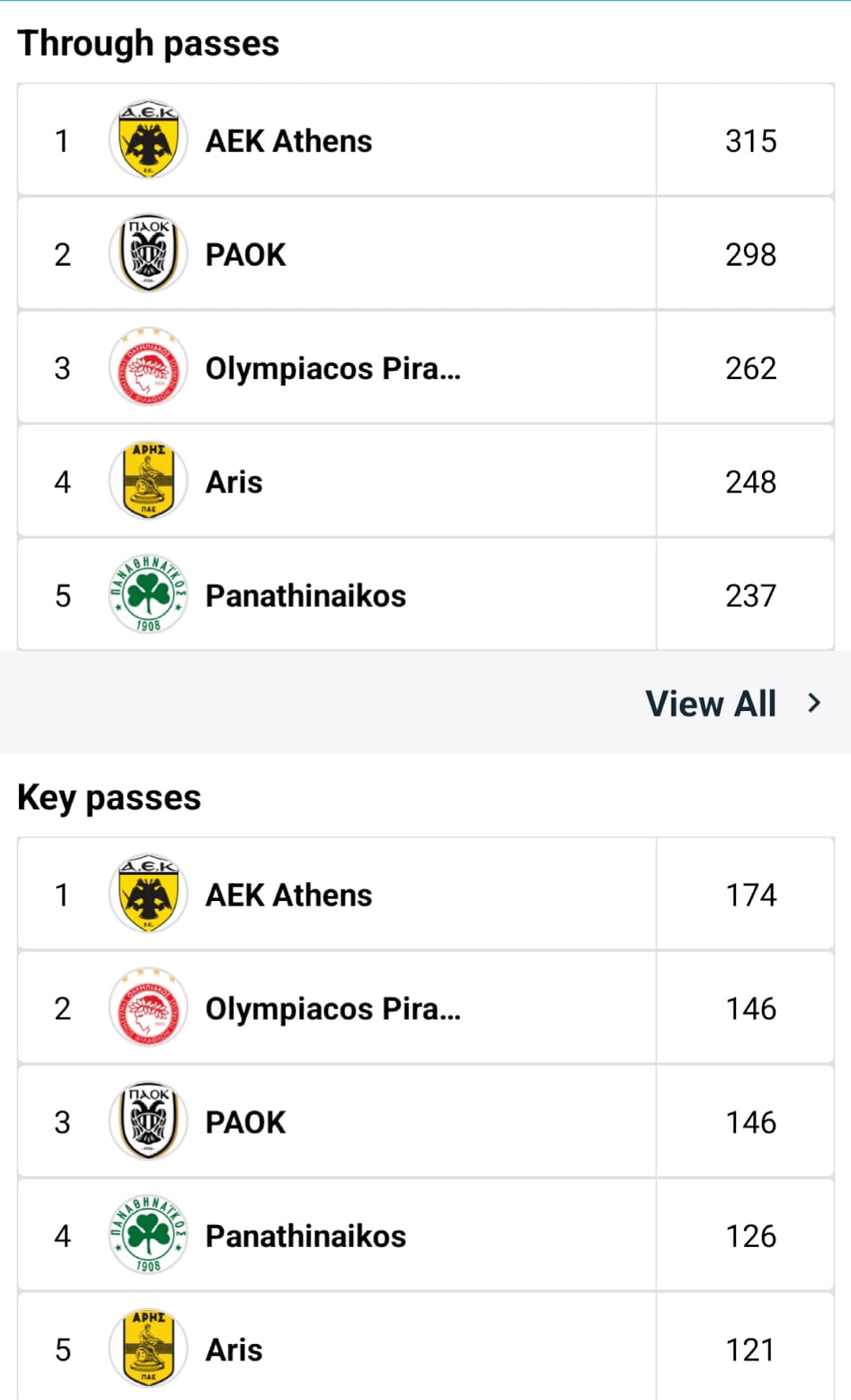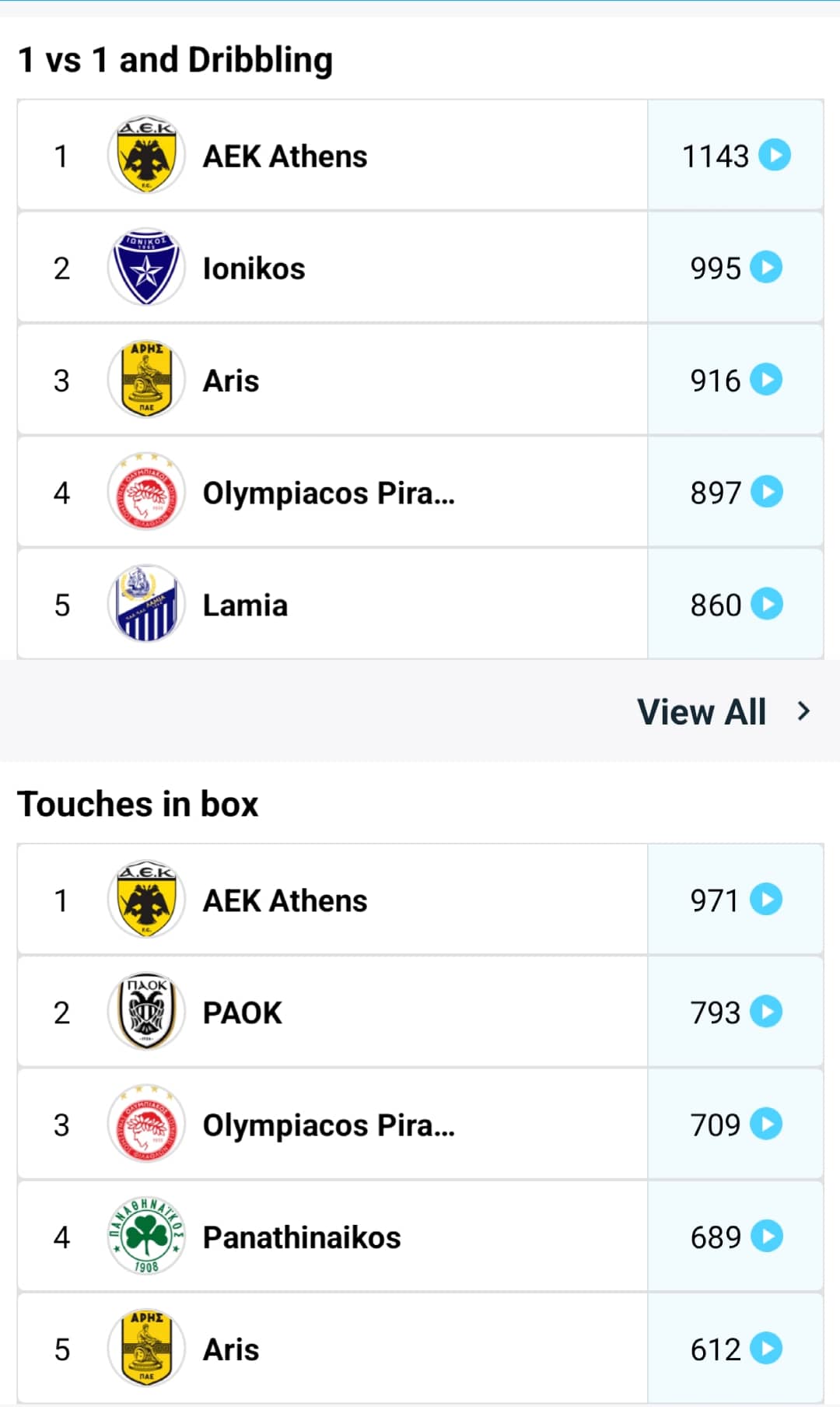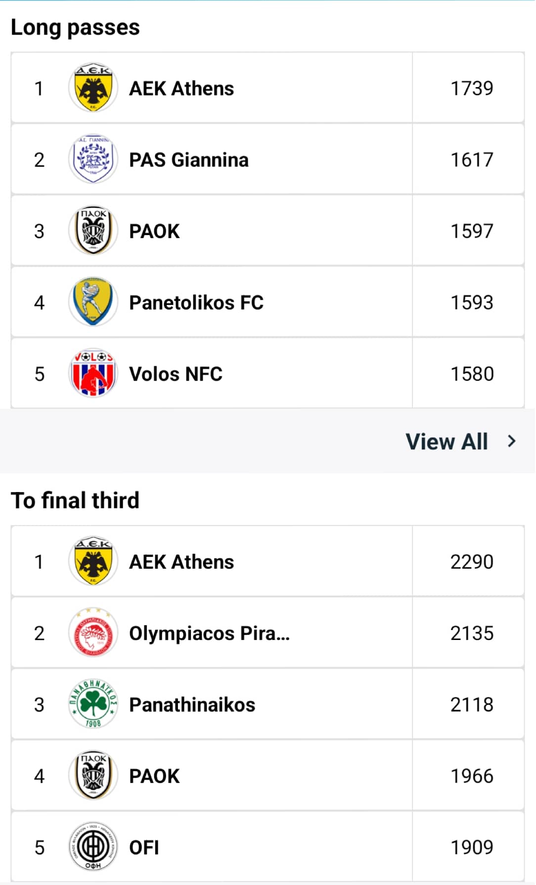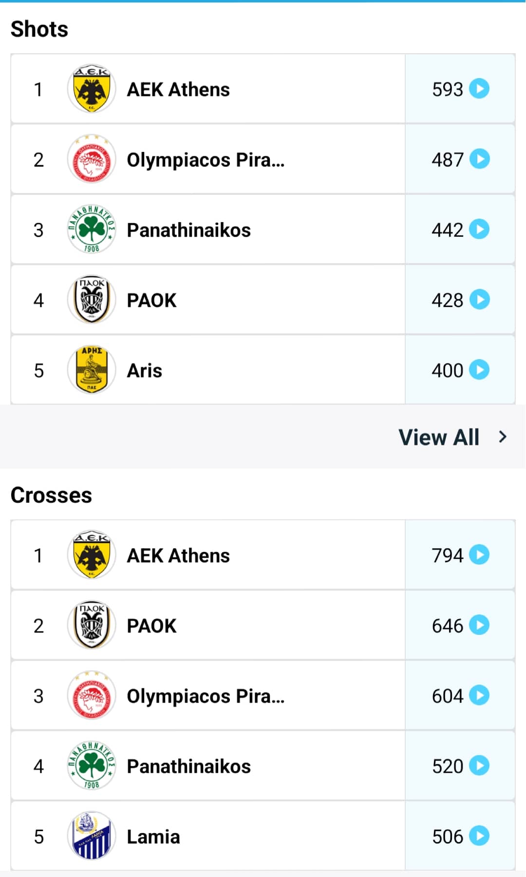 Επίσης στις σέντρες, η ΑΕΚ άφησε στην δεύτερη θέση τον ΠΑΟΚ με 148 περισσότερες. 794 η ΑΕΚ 646 ο ΠΑΟΚ.