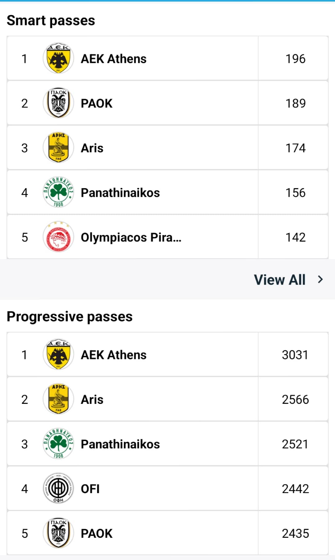 Το σήμα κατατεθέν της ΑΕΚ την φετινή σεζόν με το εντυπωσιακό νούμερο να φτάνει στις 5,73 μεταβιβάσεις που επέτρεψε η ΑΕΚ στον κάθε αντίπαλό της πριν κερδίσει την μπάλα. Στην δεύτερη θέση ο ΠΑΟΚ με 7,80 τρίτος ο ΟΦΗ με 7,87, και τέταρτος ο Παναθηναϊκός με 8,32.