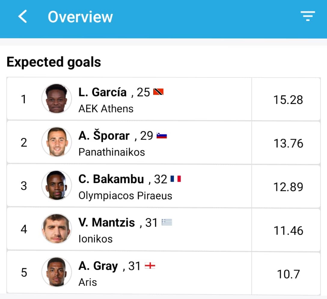 Η κατηγορία των xG έχει να κάνει βάσει της ποιότητας των ευκαιριών, πόσα γκολ έπρεπε να είχε πετύχει η κάθε ομάδα. Η ΑΕΚ θα έπρεπε λοιπόν να είχε πετύχει 3 γκολ παραπάνω από αυτά που πέτυχε τελικά, όντας στην πρώτη θέση. Ενώ αντίστοιχα ο Ολυμπιακός που πέτυχε 70 γκολ βάσει των ευκαιριών του, θα έπρεπε να είχε πετύχει 2 γκολ λιγότερα.