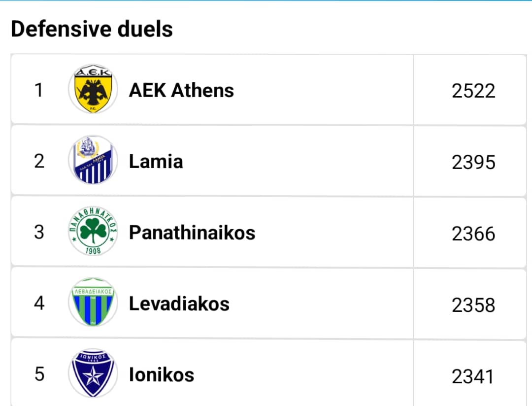 Πρώτη και στις αμυντικές μονομαχίες η ΑΕΚ, κάτι που φανερώνει την επιθετική άμυνα που έκανε η ομάδα καθ’ όλη την διάρκεια του πρωταθλήματος. Στην δεύτερη θέση η Λαμία και στην τρίτη ο Παναθηναϊκός.