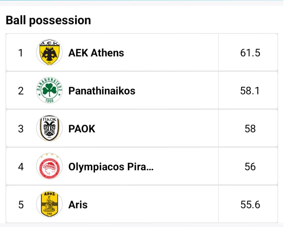 Με 61,5% στην πρώτη θέση στην κατοχή μπάλας με το κυριαρχικό ποδόσφαιρο που έπαιξε η ομάδα του Ματίας Αλμέιδα, αφήνοντας δεύτερο τον Παναθηναϊκό με 58,1%.