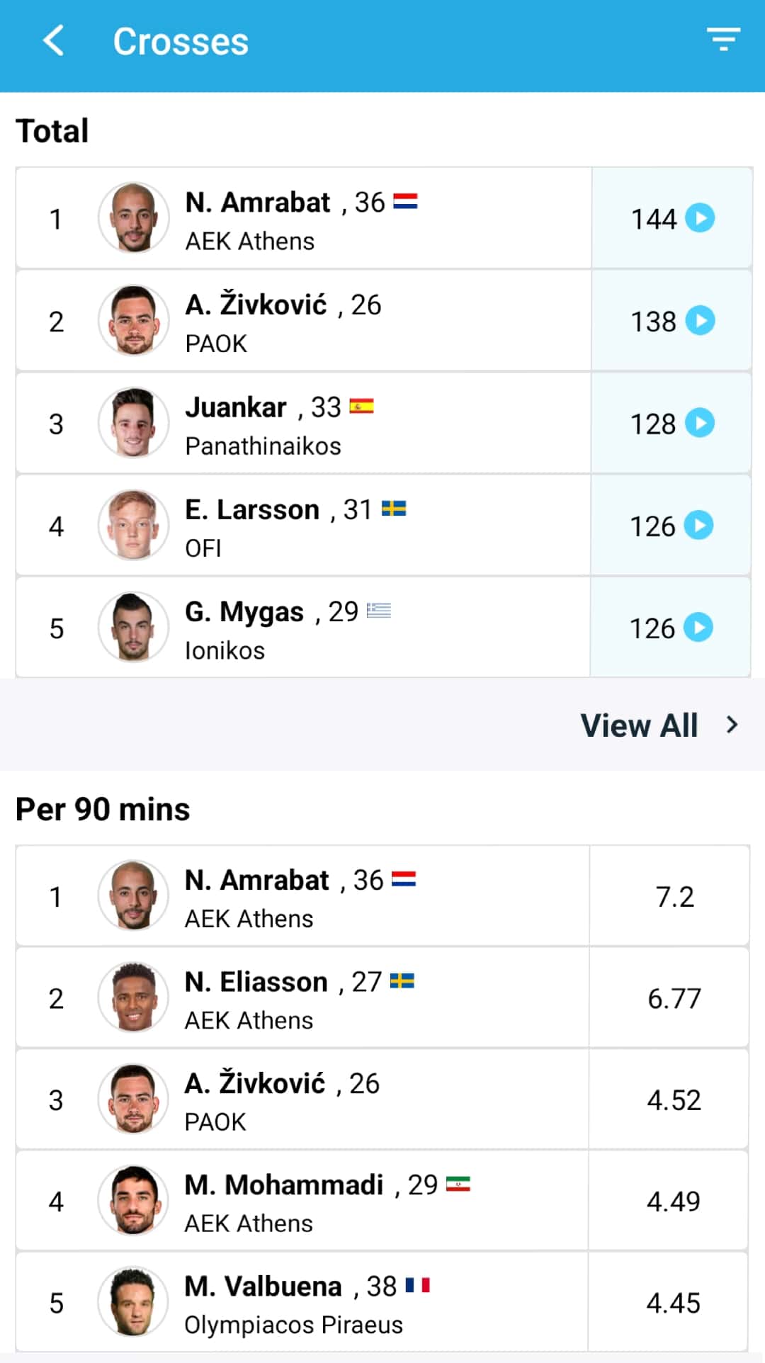 Συνεχίζοντας στην κατηγορία σέντρες, συνολικά ο Νορντίν Άμπραμπατ στην πρώτη θέση με 144 και ανά 90 λεπτά ο ίδιος παίκτης με δεύτερο τον Νίκλας Ελίασον και τέταρτο τον Μίλαντ Μοχαμάντι.
