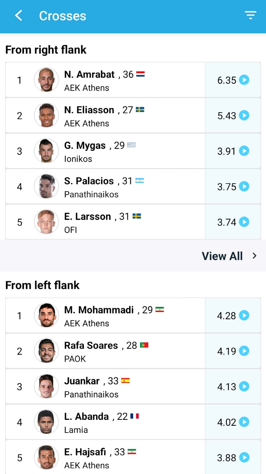 Στις σέντρες και από τις δύο πτέρυγες είχαμε πρωτιές από παίκτες της ΑΕΚ. Από την δεξιά πλευρά στην πρώτη θέση ο Νορντίν Άμπραμπατ με 6,35, και στην δεύτερη θέση ο Νίκλας Ελίασον με 5,43.
