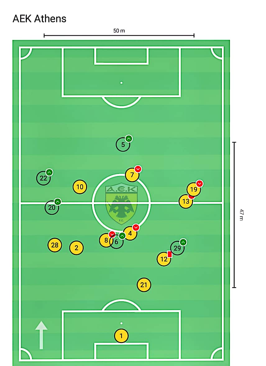 Είναι φυσικό επακόλουθο ότι όταν μία ομάδα μένει με παίκτη λιγότερο για 90΄λεπτά, τα στατιστικά και τα νούμερα, δεν θα μπορούσαν να είναι με το μέρος της. Κατηγορίες όπως η κατοχή, το πρεσάρισμα, οι ευκαιρίες, τα xG, και οι μεταβιβάσεις, βρίσκουν την ΑΕΚ πολύ μακριά από τα συνηθισμένα της νούμερα. Δεν μπορούμε να σταθούμε εκεί.