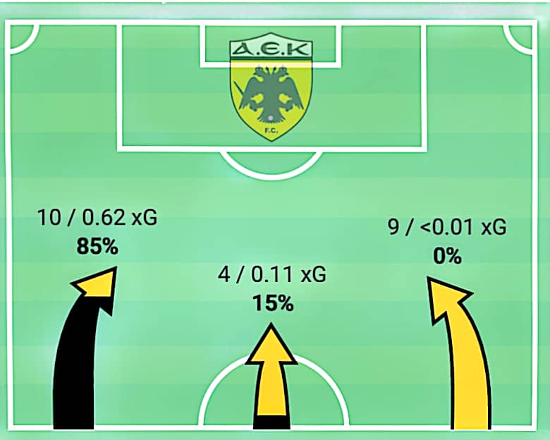 Παρόλο που η ΑΕΚ αναγκάστηκε να παίξει σε χαμηλά μέτρα στο γήπεδο, πάτησε 10 φορές στην περιοχή του ΠΑΟΚ, έκανε 6 τελικές με τις 3 στον στόχο, και τις 2 από αυτές να καταλήγουν στα δίχτυα. Είχε 66% ποσοστό ευστοχίας. Οι περισσότερες και οι ποιοτικότερες επιθέσεις σύμφωνα και με το γράφημα, έγιναν από την αριστερή πλευρά, 10 επιθέσεις με το ποσοστό των xG να είναι στο 0,62.