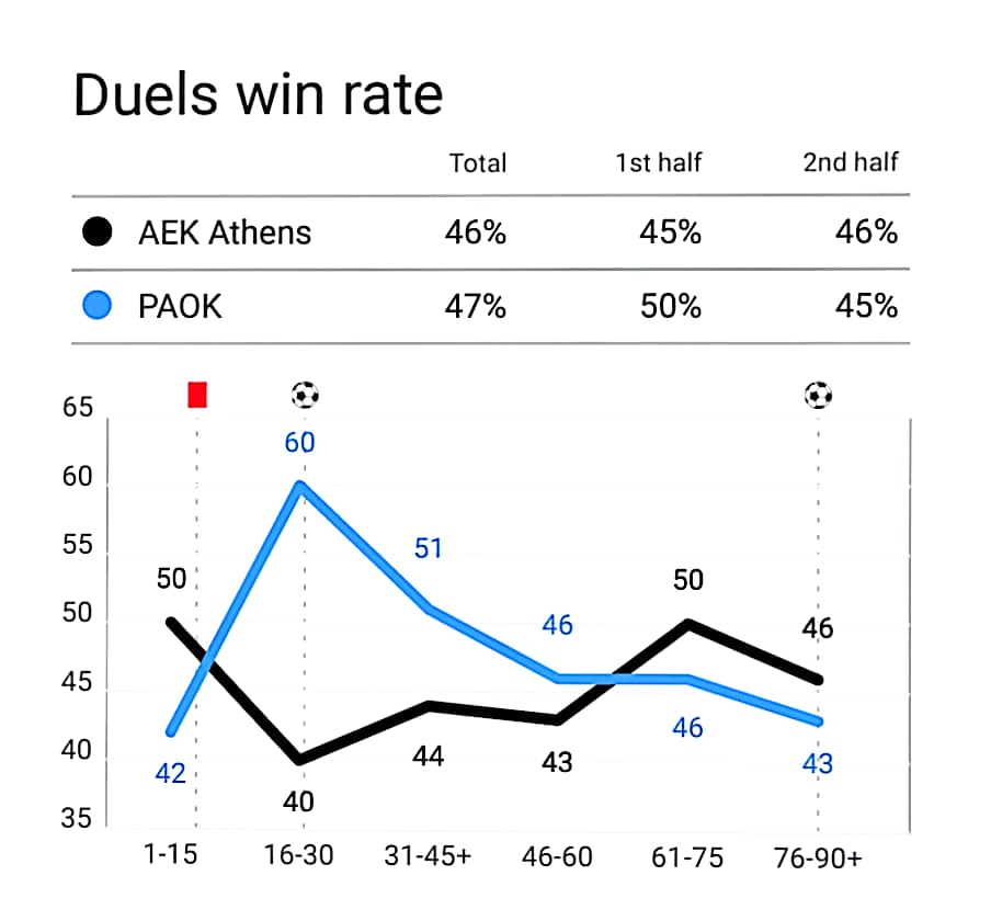 Μια κατηγορία όμως που μπορούμε να δούμε και έχει ενδιαφέρον, είναι οι μονομαχίες. Όπως μπορούμε να δουμε στο δεύτερο ημίχρονο και ειδικά απο το 61′ λεπτό την στίγμη των πρώτων αλλαγών, η Ένωση κέρδισε όλες τις μονομαχίες και εκέι ήταν και το σημείο κλειδί του αγώνα.