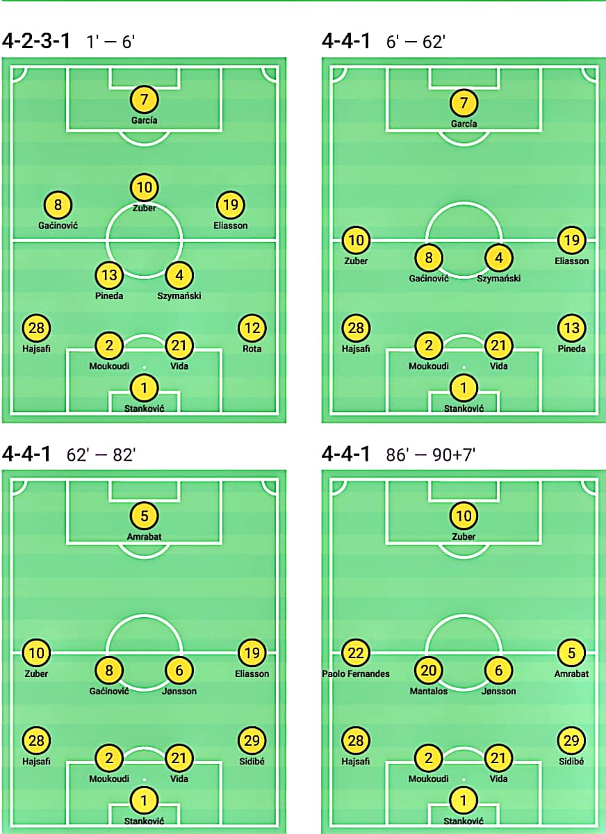 Αυτό που μπορούμε να παρατηρήσουμε απο το 6′ λεπτό και μέχρι και το τέλος του παιχνιδιού, είνα οι αλλαγές θέσεις του Στίβεν Τσούμπερ. Αρχικά ξεκίνησε σαν δεύτερος επιθετικός πίσω απο τον Λιβάι Γκαρσία, στο 6΄λεπτό γυρίζει αριστερά στον χώρο του κέντρου σε αυτό το 4-4-1, και απο το 86΄λεπτό μέχρι και τις καθηστερήσεις πέρασε σαν μοναδικός επιθετικός. Τρεις διαφορετικές θέσεις στις οποίες και στις τρείς ανταποκρίθηκε εξαιρετικά με απίστευτες δυνάμεις και θέληση.