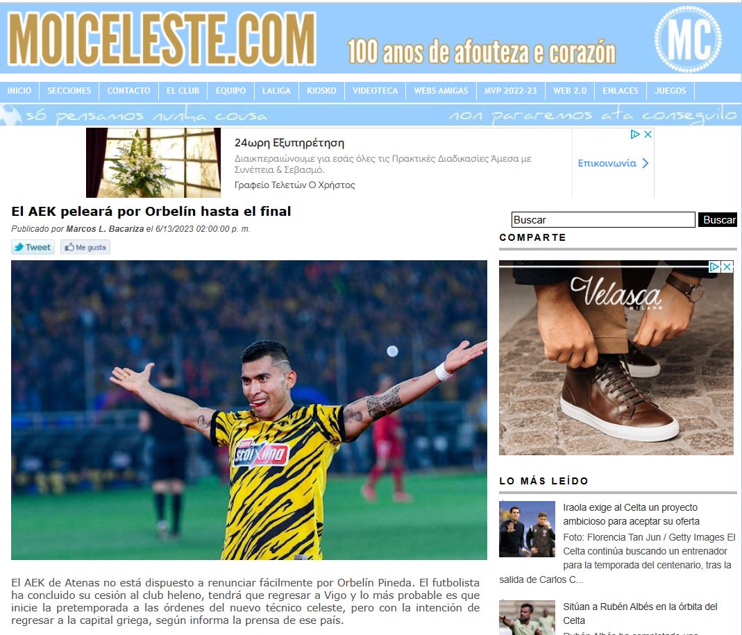 «Η ΑΕΚ θα παλέψει για τον Πινέδα μέχρι τέλους», αναφέρει σε σημερινό της δημοσίευμα η ιστοσελίδα «moiceleste.com» που ασχολείται αποκλειστικά με την επικαιρότητα της Θέλτα.