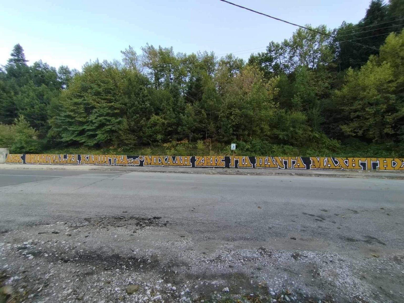 Το όμορφο γκράφιτι που δημιουργήθηκε σε τοίχο στην Λίμνη Πλαστήρα από την Original 21 γράφει το εξής: «Μιχάλη ζεις για πάντα μαχητής»!
