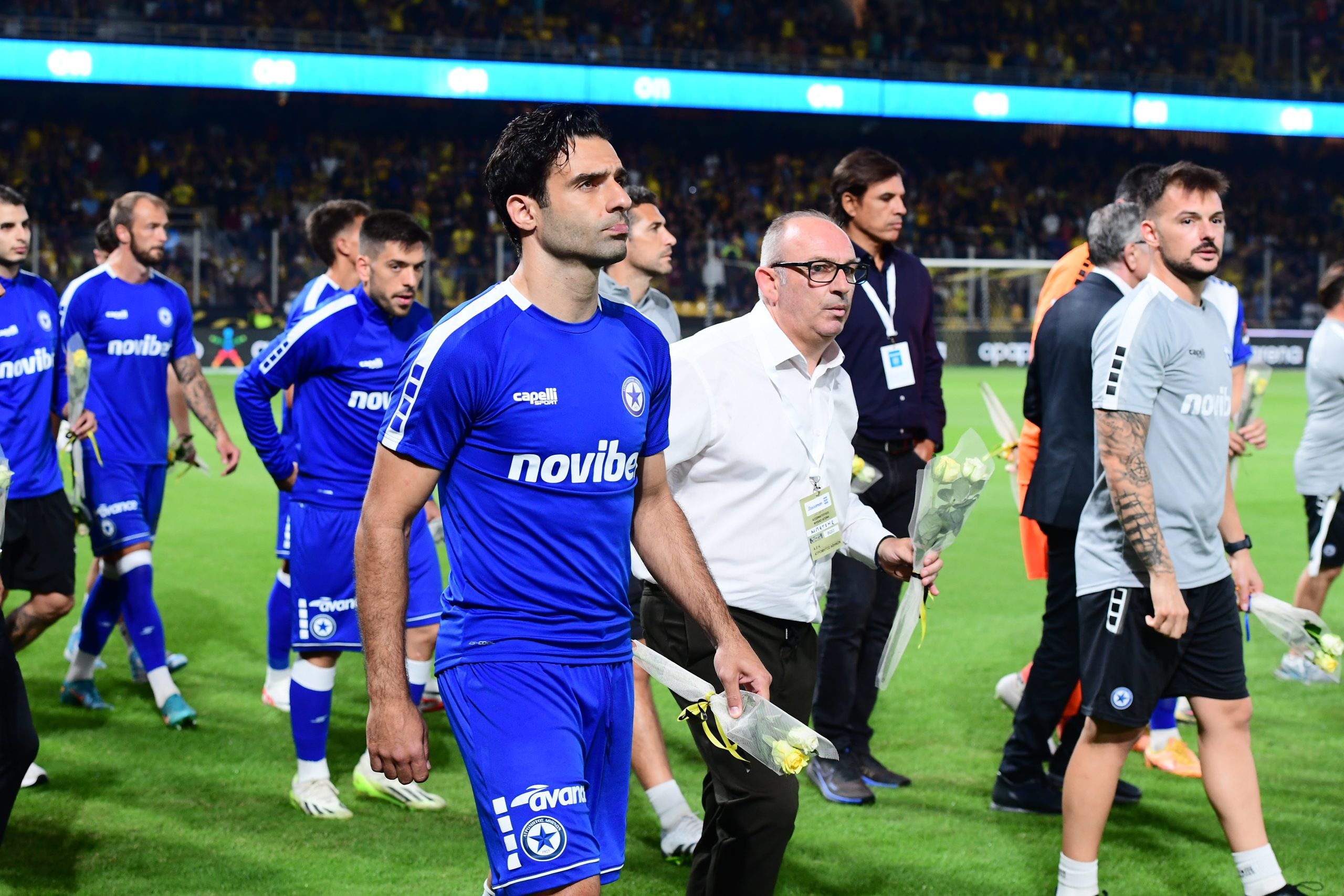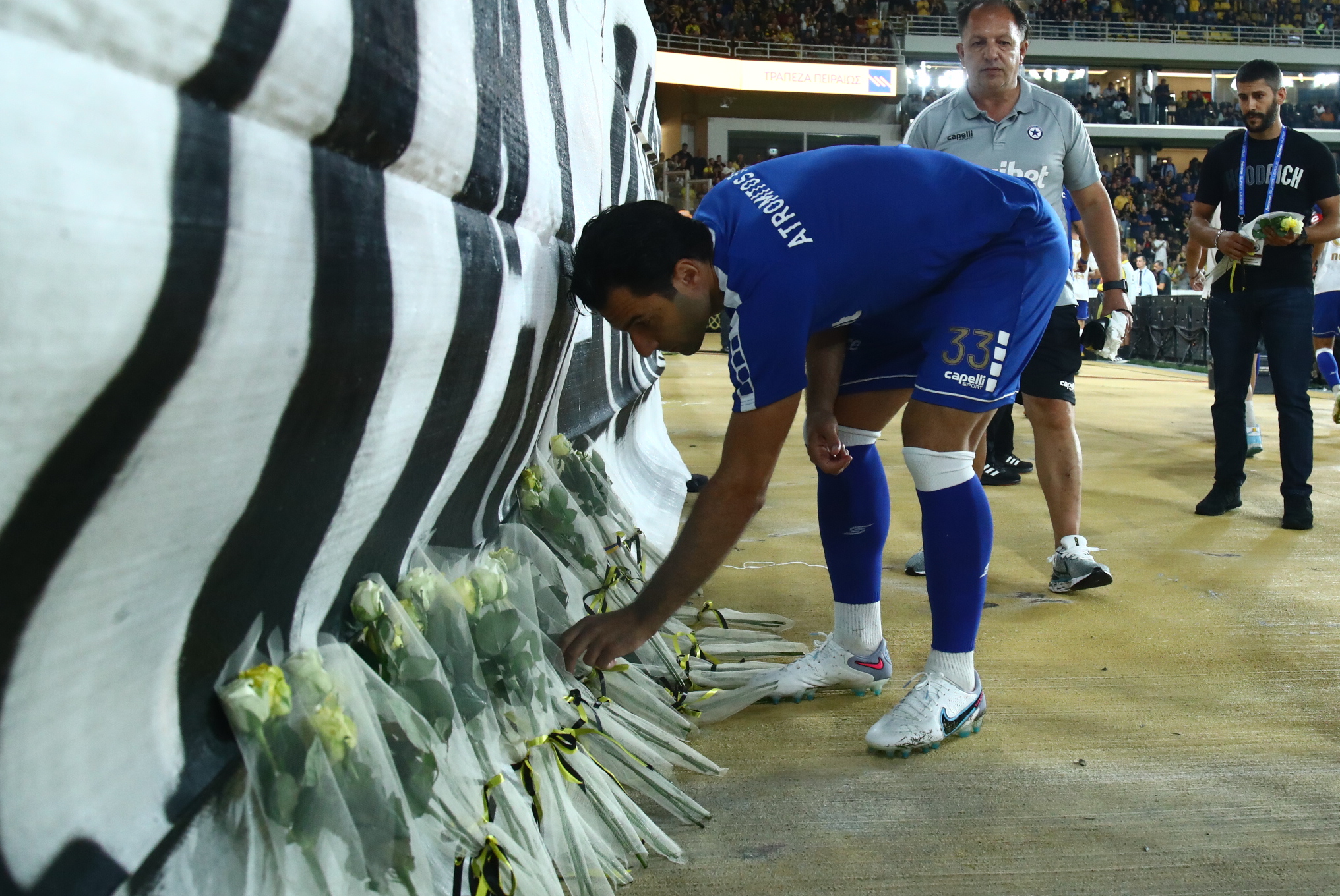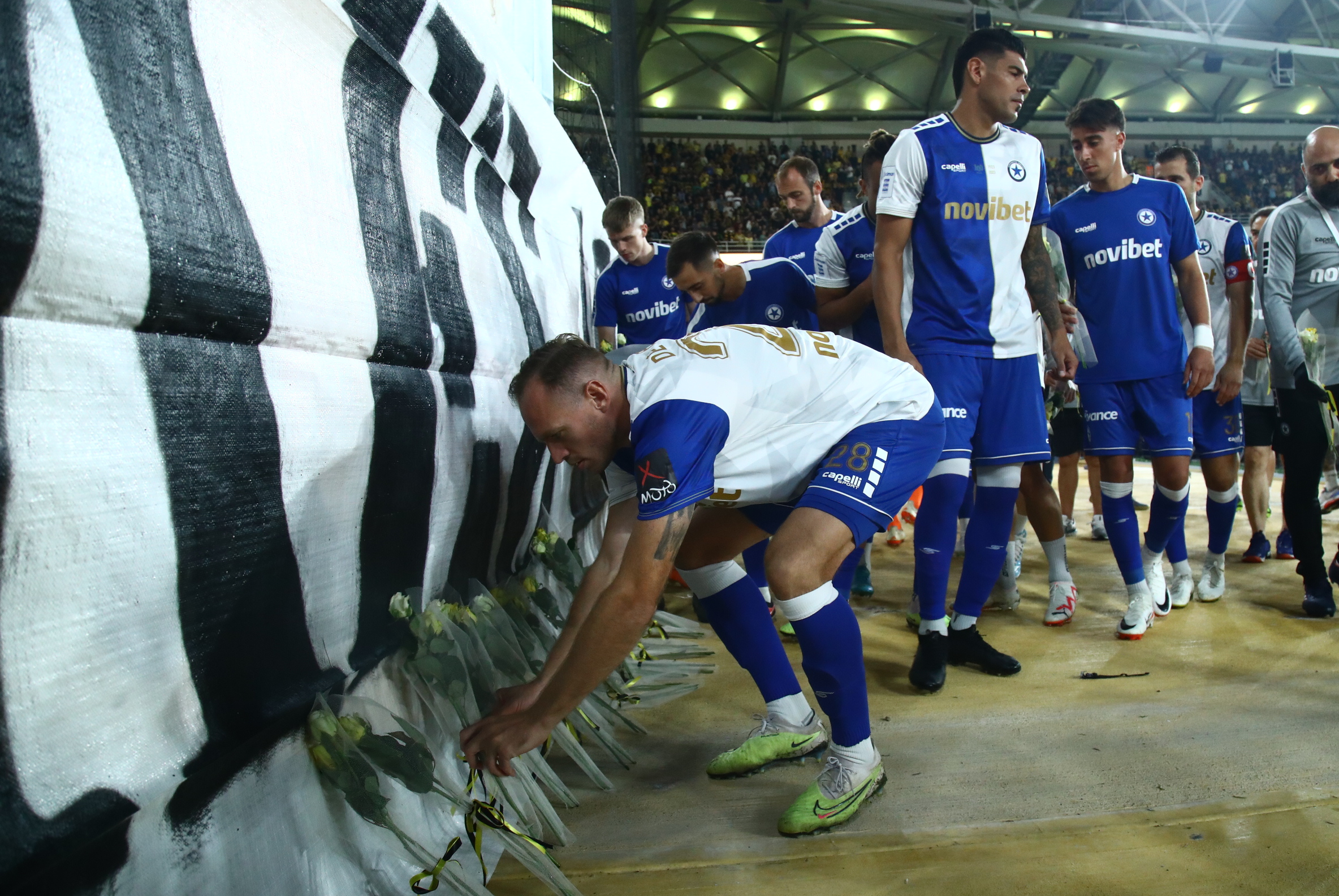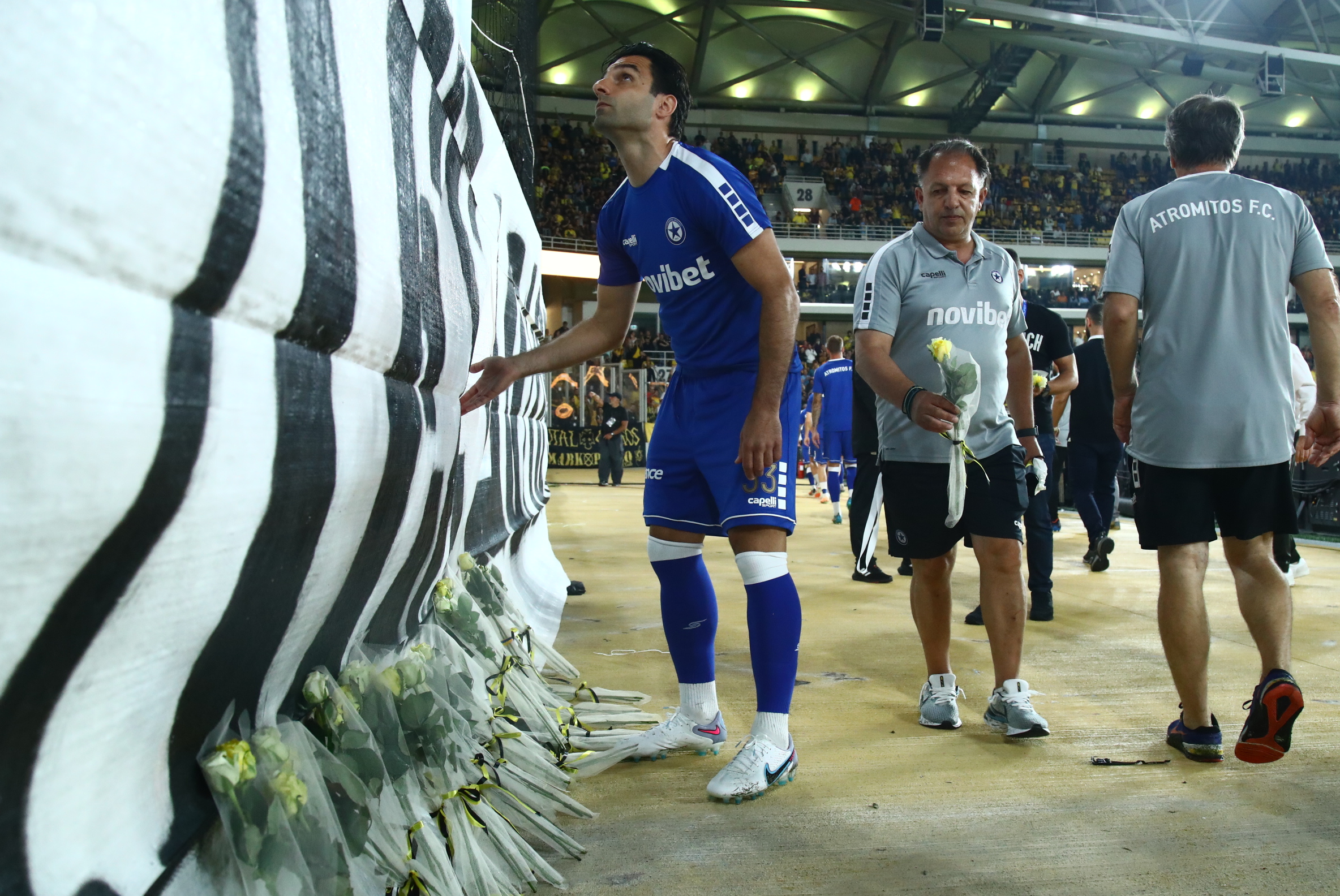 Οι φιλοξενούμενοι κατέθεσαν λουλούδια στην φωτογραφία του δολοφονημένου Μιχάλη Κατσούρη που πήρε θέση ξανά στην κερκίδα των οργανωμένων της ΑΕΚ.