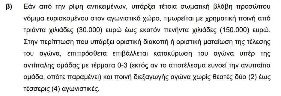 «Εάν από την ρίψη αντικειμένων, υπάρξει τέτοια σωματική βλάβη προσώπου νόμιμα ευρισκομένου στον αγωνιστικό χώρο, τιμωρείται με χρηματική ποινή από τριάντα χιλιάδες (30.000) ευρώ έως εκατόν πενήντα χιλιάδες (150.000) ευρώ.
