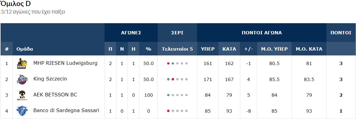 Η βαθμολογία στον όμιλο της ΑΕΚ: