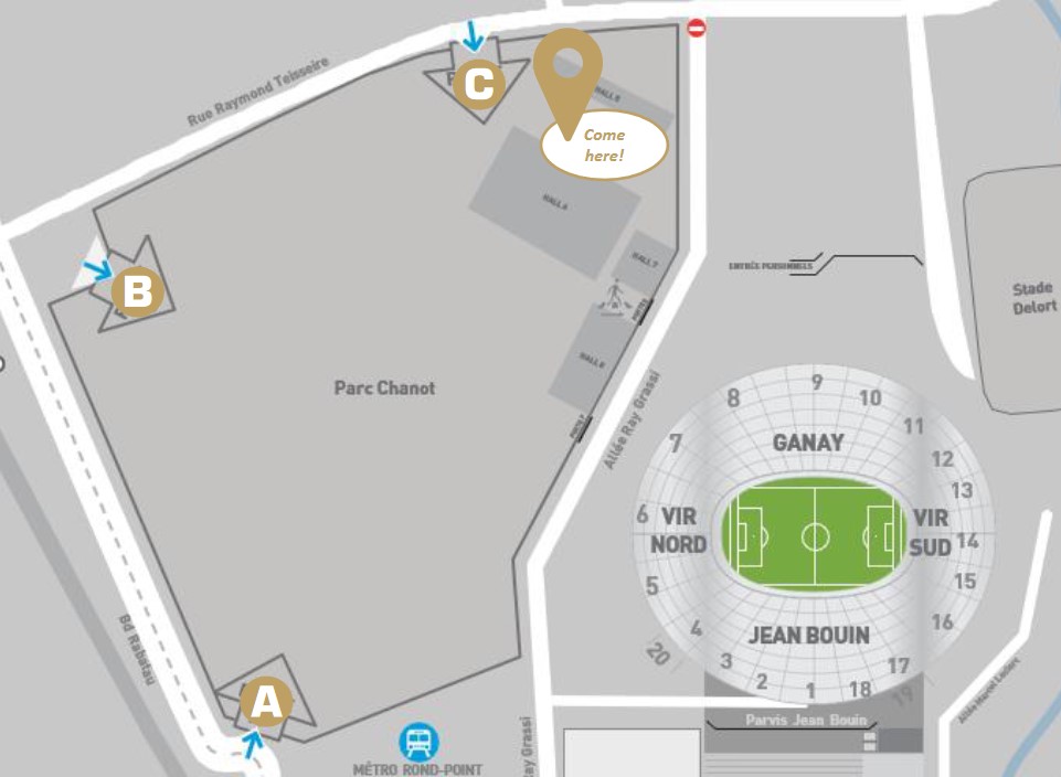 Αυτό είναι στο PARC CHANOT, δίπλα στο Στάδιο Βελοντρόμ. Η συγκέντρωση των οπαδών της ΑΕΚ στο εν λόγω σημείο συνάντησης και η οργανωμένη μετάβασή τους εντός του γηπέδου είναι υποχρεωτική. Το meeting point θα λειτουργήσει την ημέρα του αγώνα από τις 14.00 (οι θύρες θα ανοίξουν στις 16.00) και σε αυτό θα πραγματοποιηθεί ο πρώτος έλεγχος εισιτηρίων, ενώ πριν από την είσοδο στο γήπεδο θα υπάρξει και σωματικός έλεγχος από την Αστυνομία.