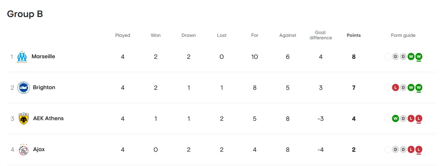 Η βαθμολογία του ομίλου: