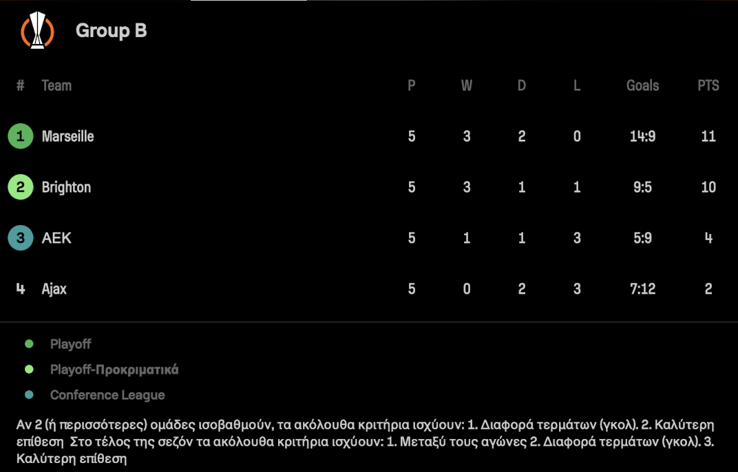 Η ΑΕΚ μετά την ήττα του Άγιαξ στη Μασσαλία, παραμένει στην 3η θέση του ομίλου και θα πάει στο Άμστερνταμ για «τελικό» και πρόκριση στο Conference League.