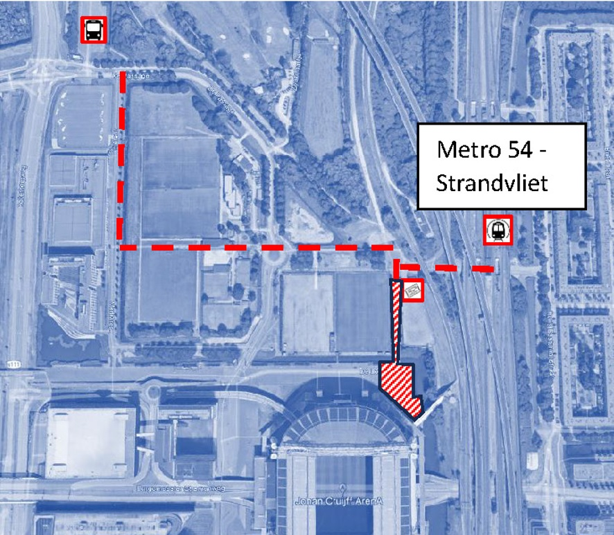 Προσοχή: οι φίλοι της ΑΕΚ πρέπει να αποφύγουν αποβίβαση στον σταθμό NS Bijlmer Station προς την νότια πλευρά του γηπέδου, διότι τον χρησιμοποιούν οι φανατικοί οπαδοί του Άγιαξ.