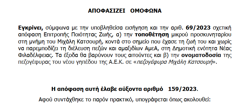 Προσκυνητάρι αποφάσισε το Δημοτικό Συμβούλιο του Δήμου ν. Φιλαδέλφειας Ν. Χαλκηδόνας να τοποθετηθεί στο σημείο που κατέρρευσε ο 29χρονος Μιχάλης Κατσουρής, ο οποίος είχε τραυματίστηκε θανάσιμα κατά τα αιματηρά επεισόδια στη Νέα Φιλαδέλφεια. Επίσης με την ίδια απόφαση θα δωθεί το όνομά του στην πεζογέφυρα προς το γήπεδο.