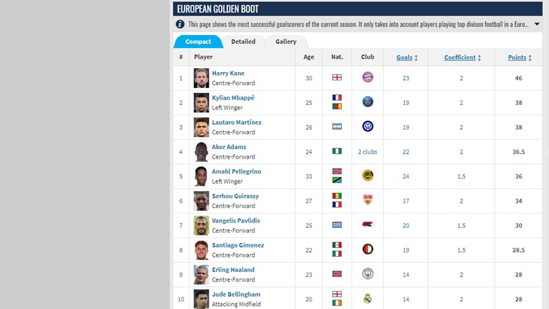Ο Άγγλος διεθνής επιθετικός έφτασε τα 23 γκολ και τους 46 βαθμούς και βρίσκεται μπροστά από τον Γάλλο διεθνή επιθετικό της Παρί Σεν Ζερμέν, Κιλιάν Μπαπέ, ο οποίος έχει 19 γκολ και 38 βαθμούς, όσα και ο Αγρεντινός επιθετικός της Ίντερ Λουτάρο Μαρτίνες , ο οποίος σκόραρε στην εκτός έδρας νίκη (1-0) των «νερατζούρι» στη Φλωρεντίνα με αντίπαλο τη Φιορεντίνα.