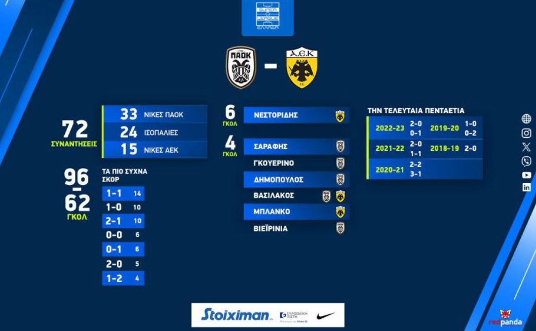 Τα αναλυτικά δεδομένα με στοιχεία και αριθμούς της προϊστορίας των αγώνων της ΑΕΚ με τον ΠΑΟΚ παρουσίασε η σελίδα της διοργανώτριας αρχής του Πρωταθλήματος, Super League.