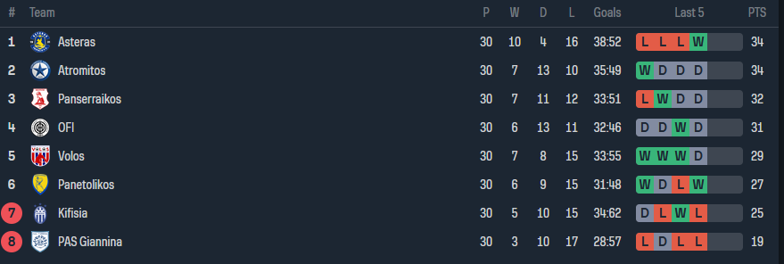 Πλέον η ομάδα των Βορείων προαστίων είναι σε δεινή θέση, ενώ μαθηματικές είναι πλέον οι ελπίδες παραμονής του ΠΑΣ Γιάννινα, που μετά την εντός έδρας ήττα από τον Αστέρα Τρίπολης, χρειάζεται πλέον ένα θαύμα στις τρεις τελευταίες αγωνιστικές για να παραμείνει στην κατηγορία…