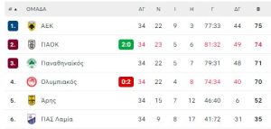 Οι ασπρόμαυροι έφτασαν στους 74 βαθμούς, έναν λιγότερο από την Ένωση, με δύο αγωνιστικές να απομένουν για το φινάλε του συγκλονιστικού πρωταθλήματος. Πλέον η ΑΕΚ καλείται να πάει στην έδρα του Ολυμπιακού και να πάρει τη νίκη, ειδάλλως θα θέλει τον Παναθηναϊκό να πάρει αποτέλεσμα μέσα στην Τούμπα.