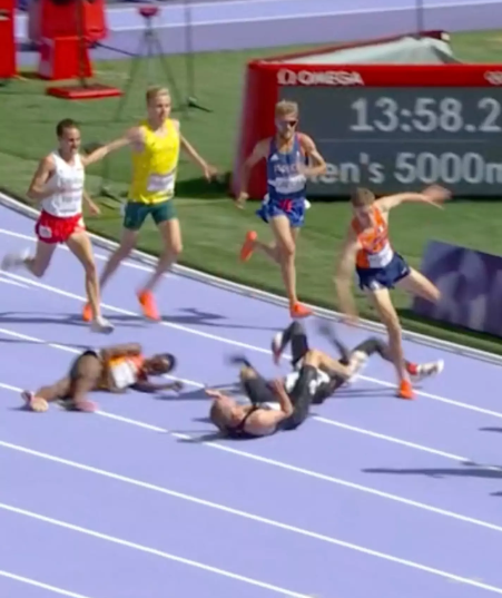 Οι δύο αθλητές ήταν δίπλα – δίπλα καθώς πλησίαζαν τη γραμμή τερματισμού πριν ο Μιλς χάσει την ισορροπία του και πέσει πάνω σε άλλους αντιπάλους σε μια αλυσιδωτή σύγκρουση.