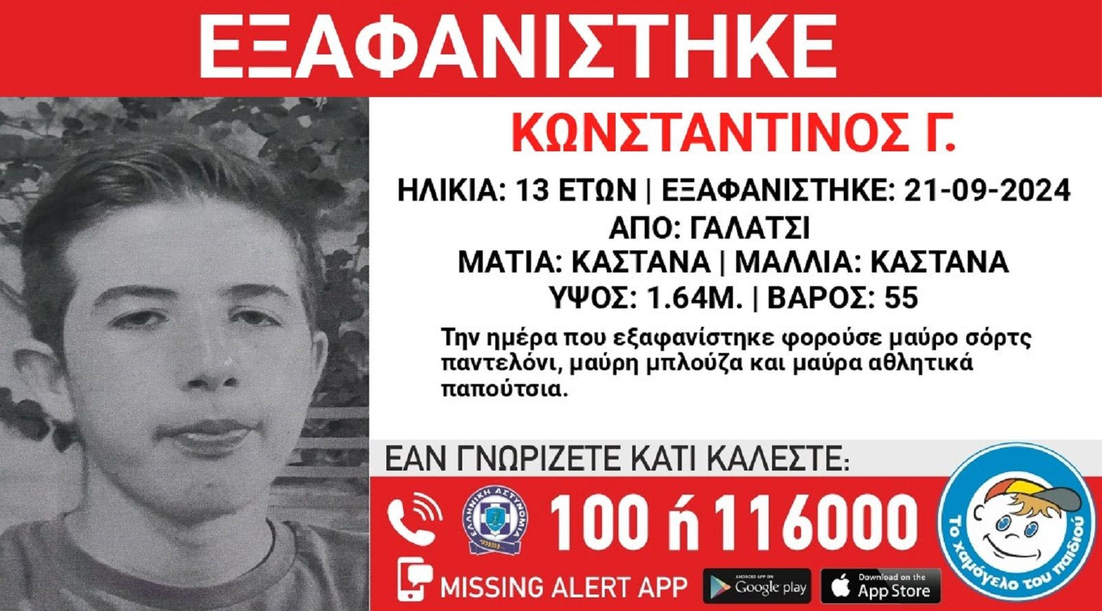 Συναγερμός έχει σημάνει στις Αρχές για την εξαφάνιση του 13χρονου Κωνσταντίνου Γ., τα ίχνη του οποίου χάθηκαν το Σάββατο (21/09) από το Γαλάτσι.