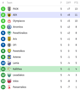 Στη δεύτερη θέση του βαθμολογικού πίνακα με 11 βαθμούς βρίσκεται πλέον η ΑΕΚ, μετά και την ολοκλήρωση της 5ης αγωνιστικής.