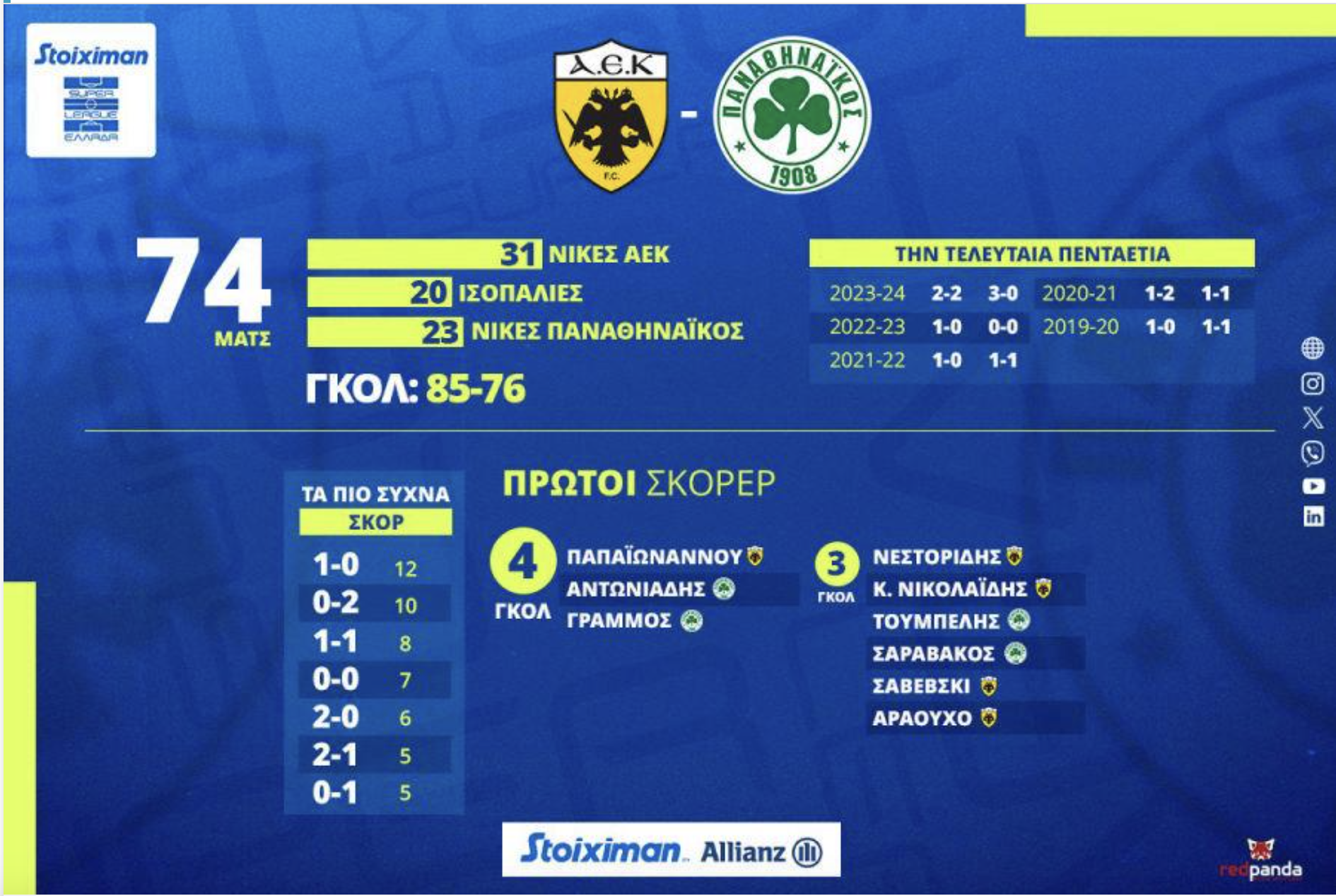Η διοργανώτρια αρχή μέσα απ’ την ιστοσελίδα της και στην προαναγγελία για το σημερινό ντέρμπι, ΑΕΚ – Παναθηναϊκός, παρουσίασε αριθμούς και στατιστικά των δυο ομάδων, απ’ τα μεταξύ τους ματς.