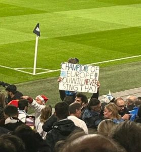 Συγκεκριμένα, από την γαλανόλευκη γωνιά του γηπέδο, αναρτήθηκε ένα πλακάτ που αναγράφει «Champions of Europe, you will never sing that», ήτοι «Πρωταθλητές Ευρώπης, δεν θα το τραγουδήσετε ποτέ»!