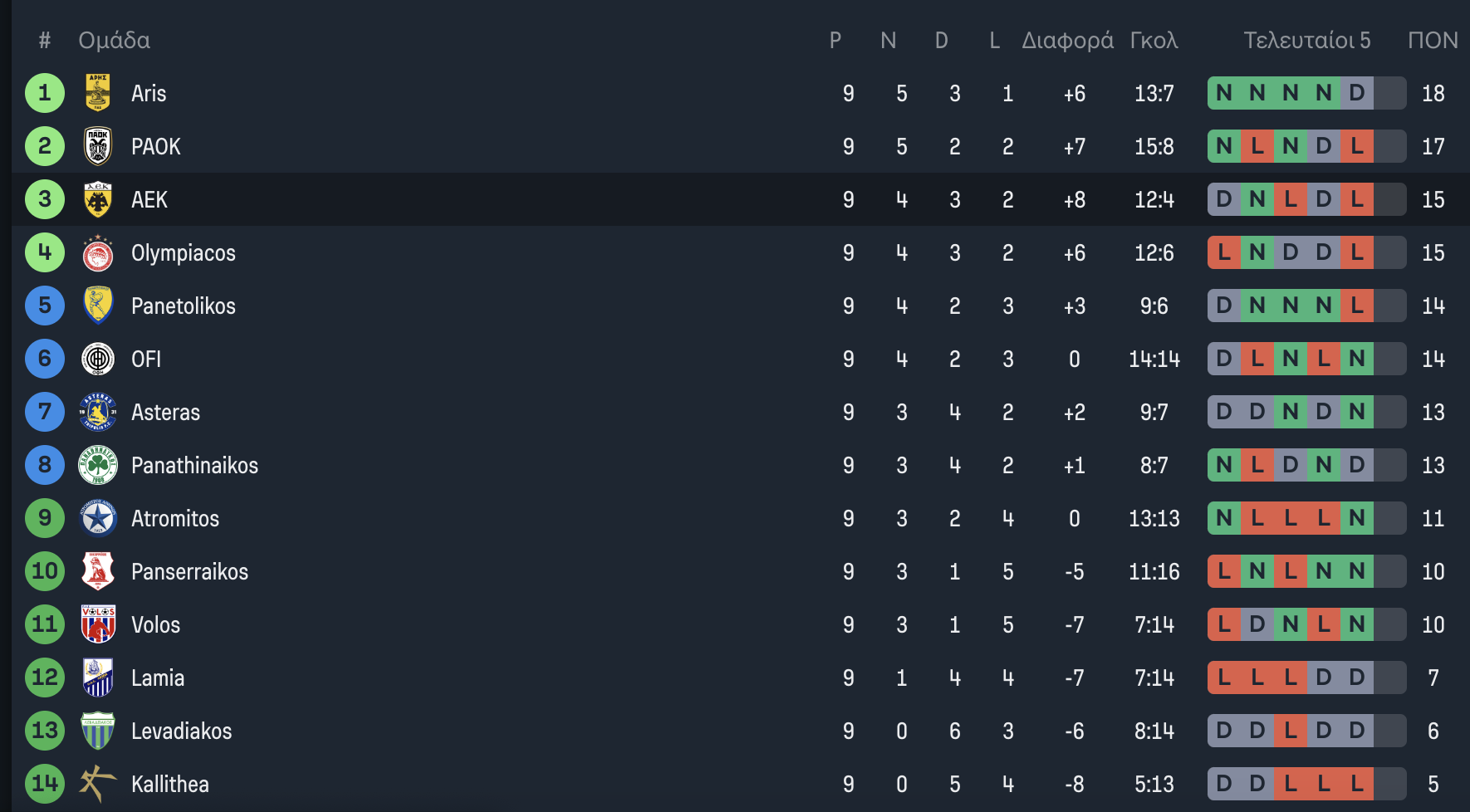 Δείτε την βαθμολογία της Super League, μετά την ολοκλήρωση της 9ης αγωνιστικής.