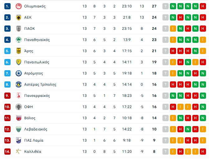 Οι πράσινοι βρίσκονται στην 3η θέση με 23 βαθμούς, ενώ ακολουθεί ο Άρης με 21.