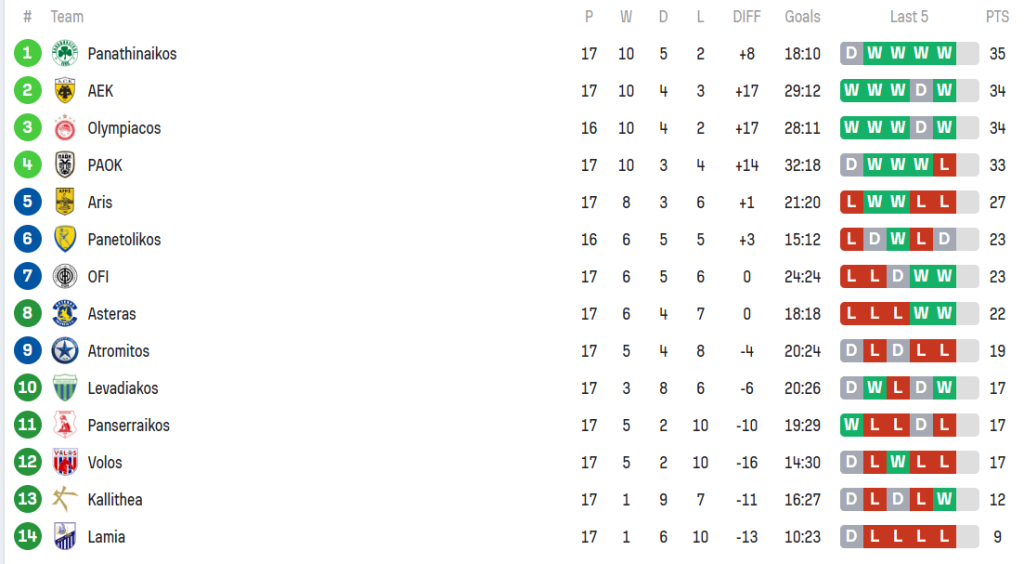 Ο ΠΑΟΚ με τη σειρά του έχασε έδαφος μένοντας 4ος στους 33.