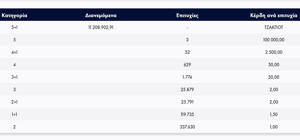 Στη δεύτερη κατηγορία αναδείχθηκαν 3 τυχεροί που κερδίζουν από 100.000 ευρώ, ενώ στην πρώτη κατηγορία σημειώθηκε νέο τζακ ποτ.